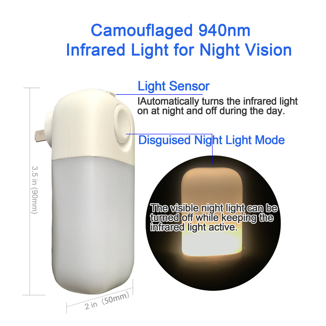 For rooms that are often dark at night, you can choose the night-vision model of this hidden WiFi outlet camera. It includes a separate mini plug-in night light that hides an invisible 940nm infrared light source: