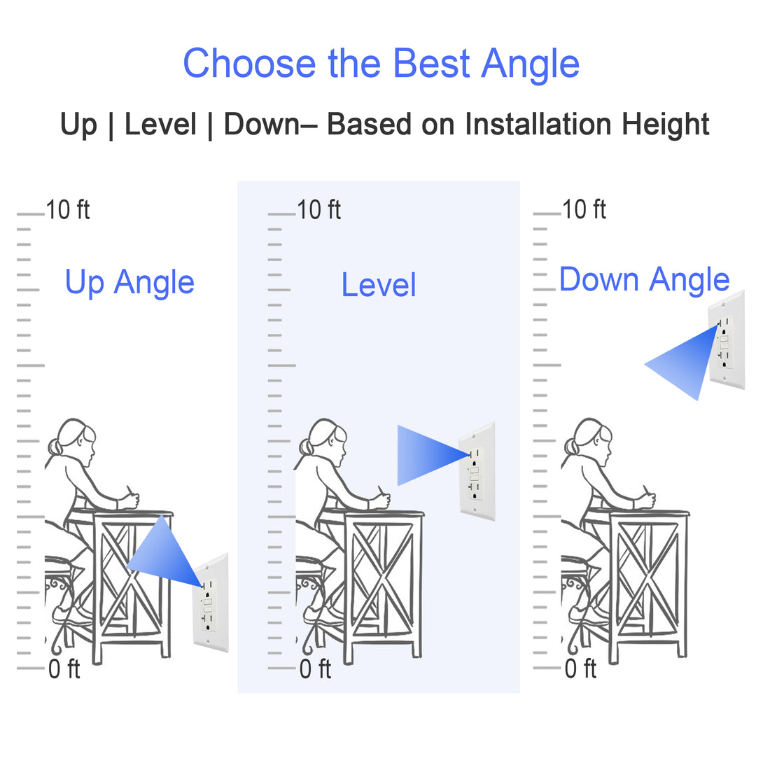 - Level angle – For outlets around desk or bed height (approx. 0.8 m / 2.6 ft). Ideal for bedrooms, living rooms and office desks.